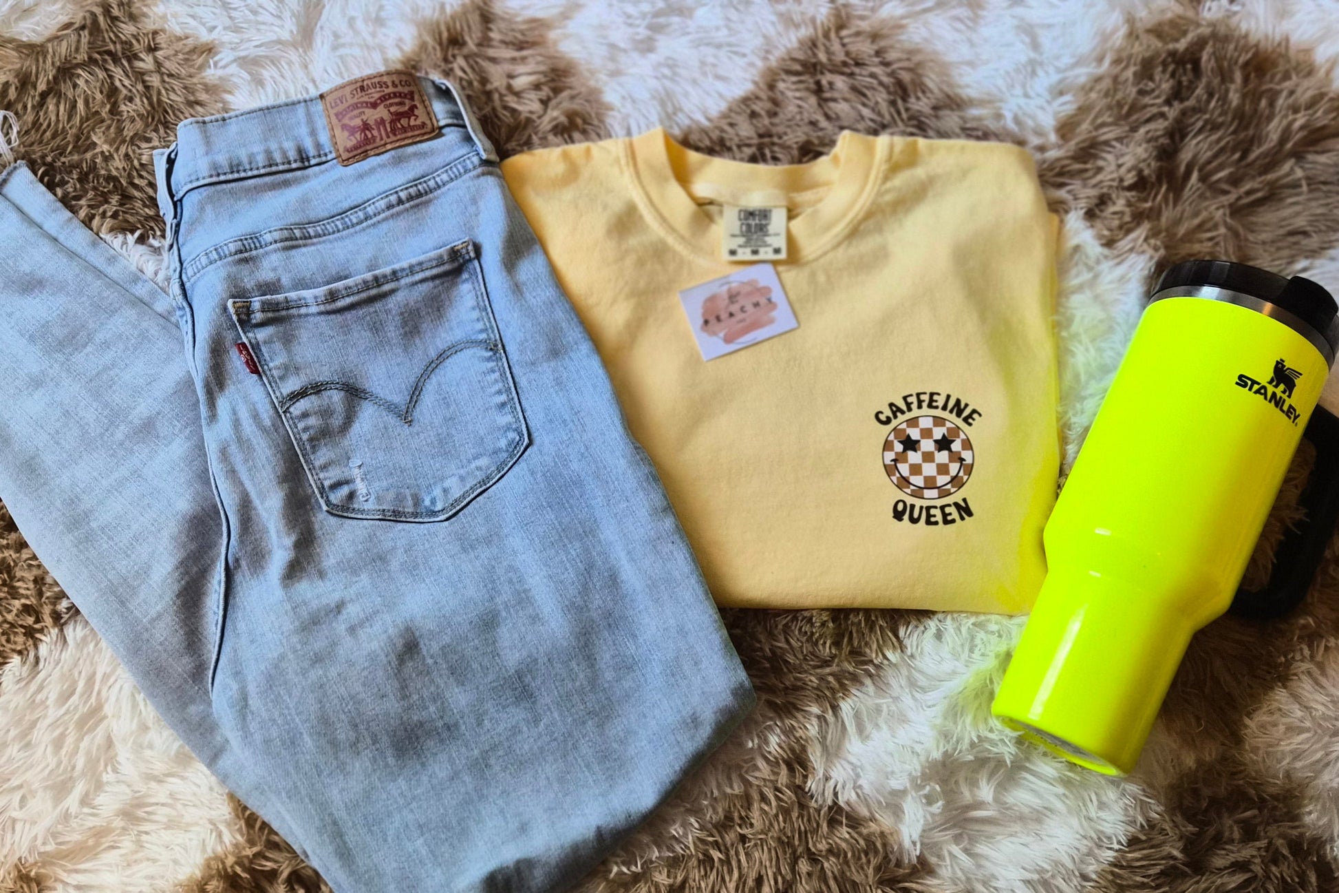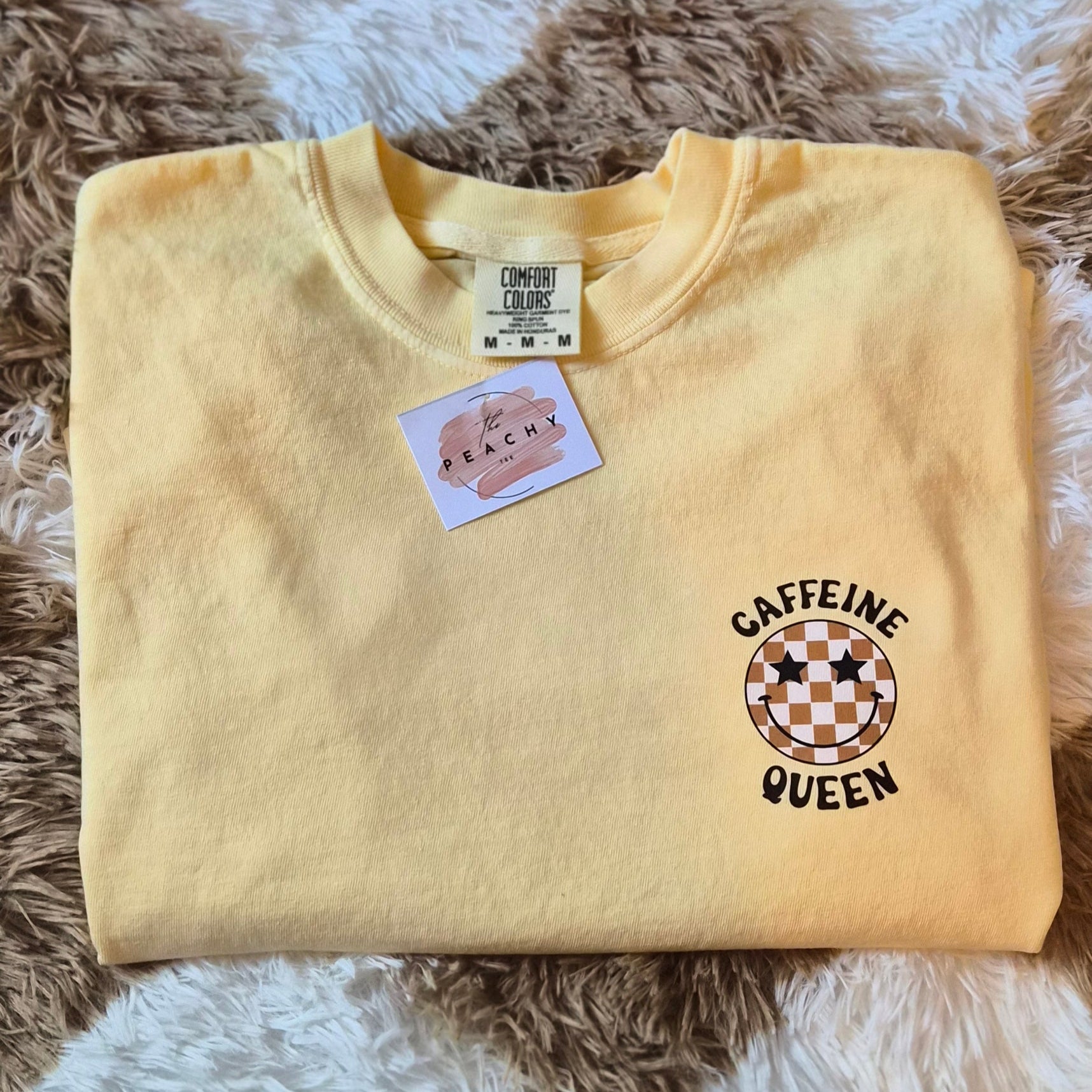 The Caffeine Queen T-shirt in buttery soft Comfort Colors fabric offers unmatched coziness for laid-back days and fun, cozy trips. Featuring a stylish Caffeine Queen logo, this ready-to-wear tee blends comfort and personality effortlessly, making it the perfect choice for those who embrace relaxation with a caffeine-fueled twist. Comes in this beautiful color, Butter.